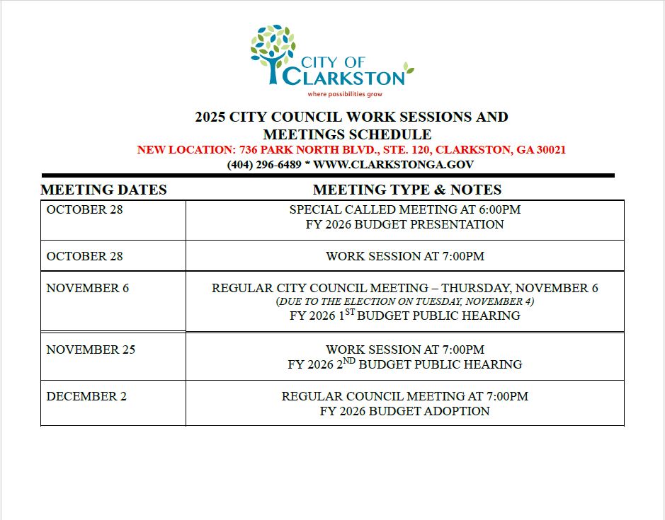 Click here to download a copy of the City of Clarkston 2025 City Council Work Session and City Council Meetings Schedule