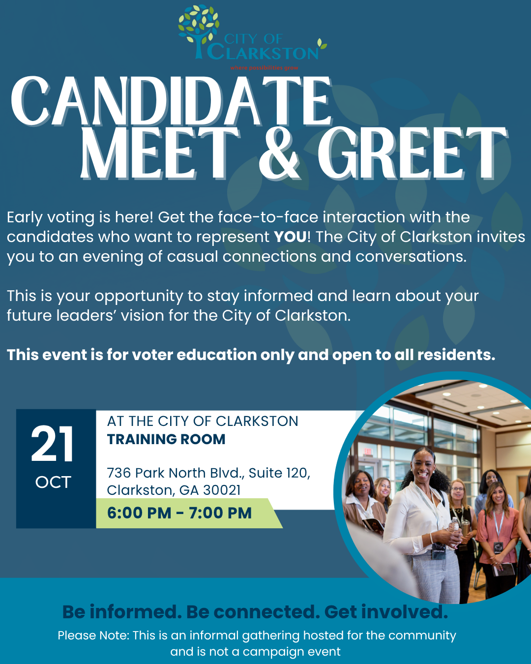 Join the City of Clarkston for an informal Meet & Greet with your local candidates. Connect and converse with those running to represent YOU!