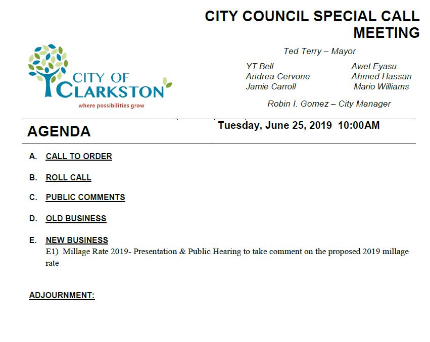 City Council Special Call - Millage Public Hearing 6-25-19 10AM