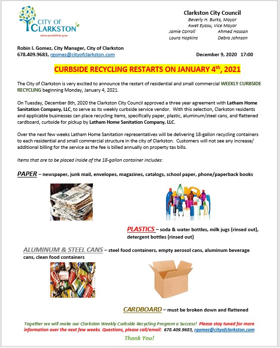The City of Clarkston is very excited to announce the restart of residential and small commercial WEEKLY CURBSIDE RECYCLING in Clarkston! Click HERE to download flyer information.