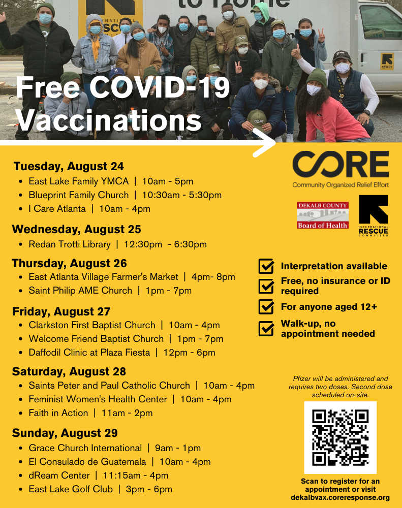Vaccines are available to everyone age 12 and over! Pfizer will be administered, and people are automatically registered for their second dose on site. Walk-Ups are available at all sites and people can also register in advance at this link: dekalbvax.coreresponse.org Available for those with and without insurance. Interpretation is available.