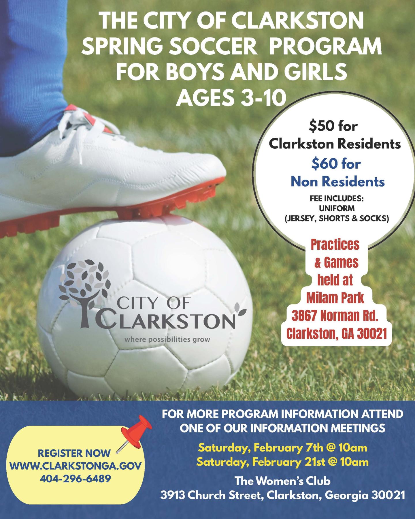 The City of Clarkston Parks and Recreation Department is proud to announce the 2026 Youth Soccer Program! Whether your child is an experienced player or new to the game, this program is designed for boys and girls ages 3-10 and all skill levels, focusing on fun, fitness, and teamwork.